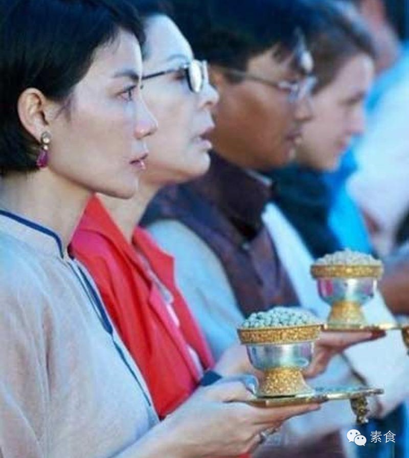 一向笃信佛教的“流行天后”王菲茹素多年,她被亚洲善待动物组织评选为2011年度“亚洲最性感素食女星”。年轻时烟酒不离的王菲,数年前为了治好女儿李嫣唇腭裂,甘心淡出娱乐圈,戒烟酒并开始吃素。自2010年底复出乐坛后,王菲的巡回演唱会场场爆满,她亦指明要求主办单位提供素食。王菲不但虔诚信佛,还影响了身边人,谢霆锋与她拍拖期间就曾被感化过。王菲怀上了“小菲女”时,李亚鹏也曾与王菲一起到重庆缙云山白云观虔诚拜佛。