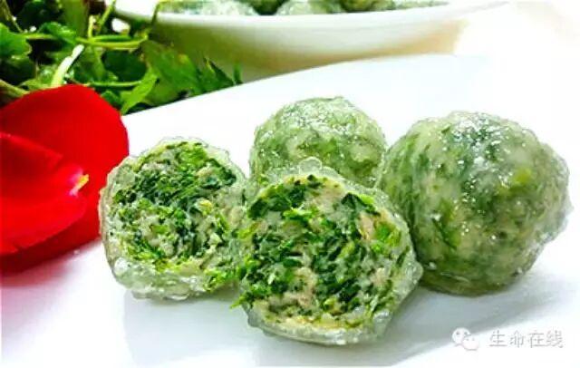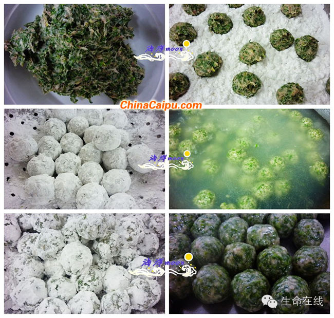 加姜末,盐和蘑菇精搅拌上劲。荠菜洗净入开水锅中烫一下捞出过凉切碎,和混合在一起做成荠菜豆腐。把淀粉倒入一个长方盘,把荠菜馅挤成一个个小丸子,放在淀粉上。 晃动盘子,让丸子滚动裹上淀粉。 放入开水锅中汆至丸子浮起。 捞出放在淀粉上再裹一层粉。再次放入开水锅中汆熟,丸子表面透明捞出。