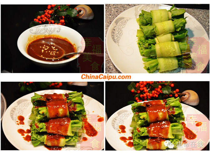 6、 将调好的汁浇在油麦菜卷上即可。