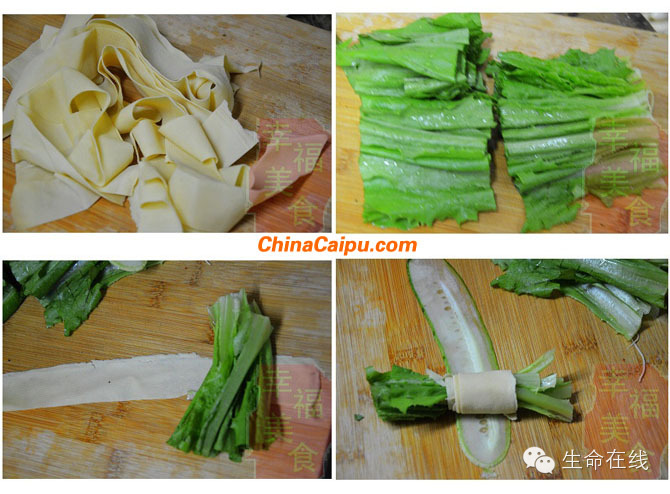 3、 将油麦菜段用豆腐皮卷起来,卷紧一些;