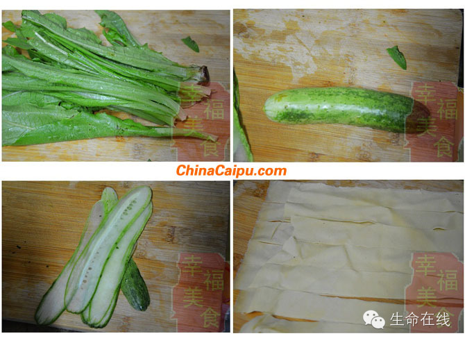 2、 豆腐皮切成1.5厘米宽的长条,黄瓜切成大薄片;