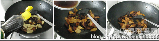 4 调入生抽、老抽、糖和盐炒匀,倒入滤清的泡冬菇水烧开;