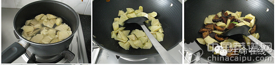 3 炒锅烧热加入有烧至4成热,先后下冬笋和冬菇煸炒一会儿;
