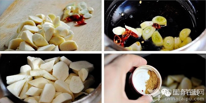 1.茭白去皮后洗净切小块、切姜片干辣椒切碎备用;
