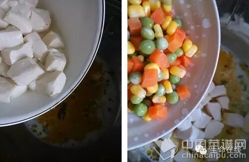 8.加入豌豆,胡萝卜丁和玉米粒等杂菜