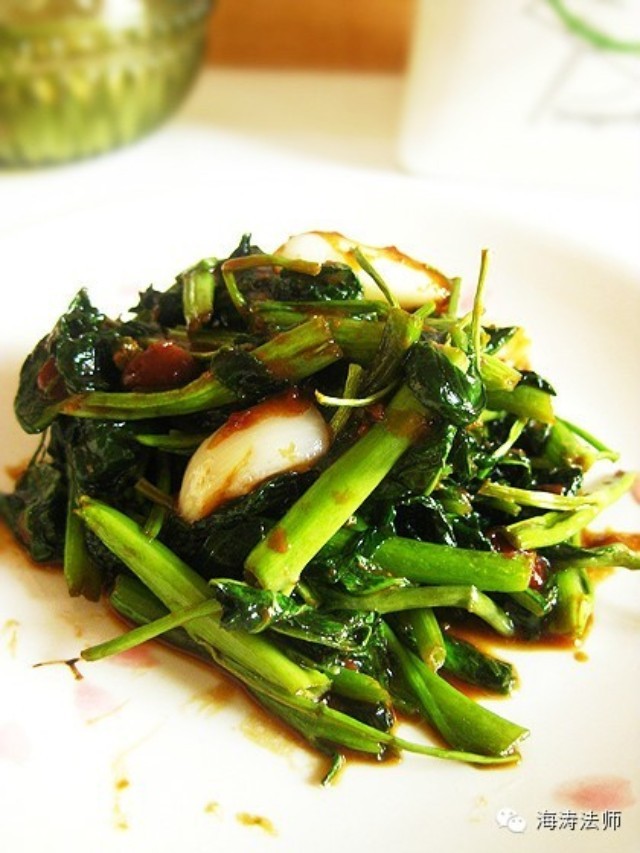 3、放入叶子炒,最后放一勺豆瓣酱煸炒即可。不用放盐。